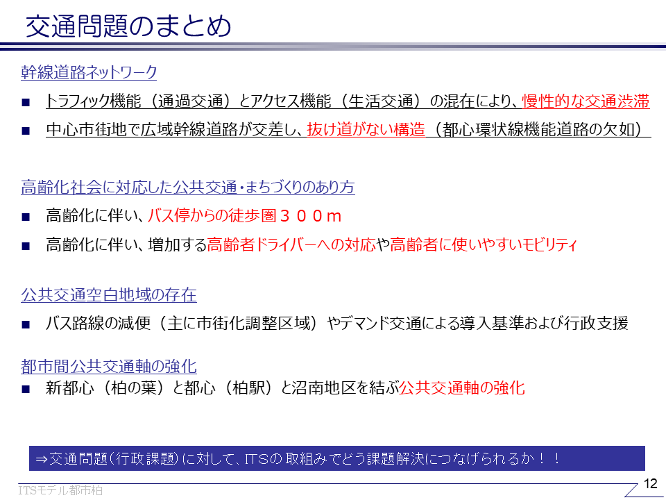 テーマ | まちづくり・公共交通に関する様々な課題について、ITS技術を活用した課題解決の可能性の検討 |