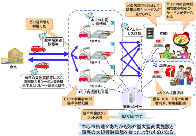 このようにICTを活用して複数の駐車場をエリアで連携させまち全体で来訪者の購買に応じた駐車料金の共通連携割引等を行うことで、駐車場利用の需要と駐車場事業者供給の時空間の偏在を調整します。このような駐車場ITSを導入することで、来訪者の滞在時間増による中心市街地での買物額の増加による商業事業者における売上げ増の一部を循環させ、関係者一同にメリットをもたらすビジネスモデルが可能になると考えられます。